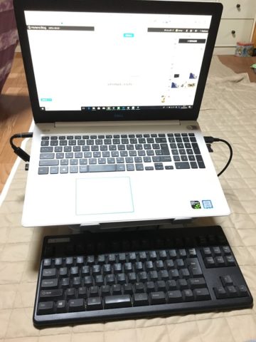 基本的にはノートの下部に空いたスペースにキーボードが置けるのが理想。半端に開いたノートパソコンの手前にキーボードを置くよりは、下部に多少でも入り込んだ状態で使えたほうが画面が近い状態で操作できるわけですから。