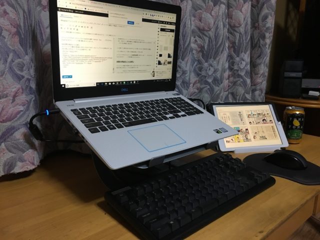実際の使用状況がこんな感じで、画面の高さも目線の高さになったので非常に肩も凝らず良い感じ。