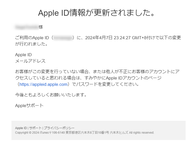 yamatarou様ご利用のApple ID(taroyama)に、2024年4月7日 23:24:27 GMT+8付けで以下の変更が行われました。