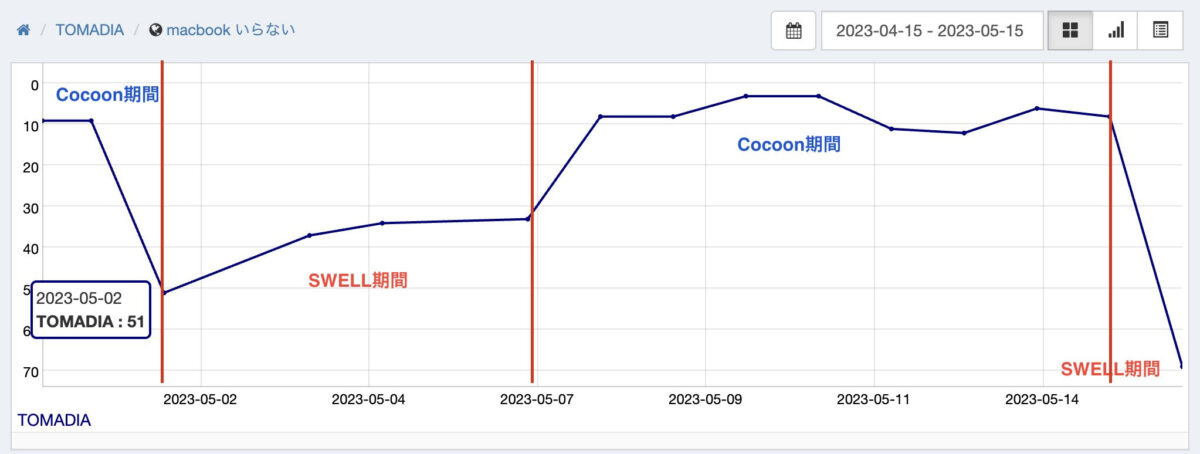 前日比でプラス50%。完全にCocoonからSWELLへの移行前のアクセス数…いや もしかしたらCocoon時代超えてきたくらいのアクセス増となりました。