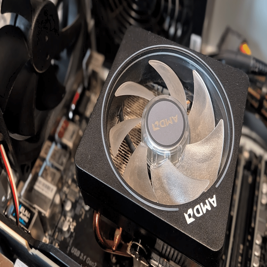 内部に目を向ければ、頼もしいCPUファンが鎮座しています。ノートPCのような薄型ファンとは、冷却性能の次元が違います。