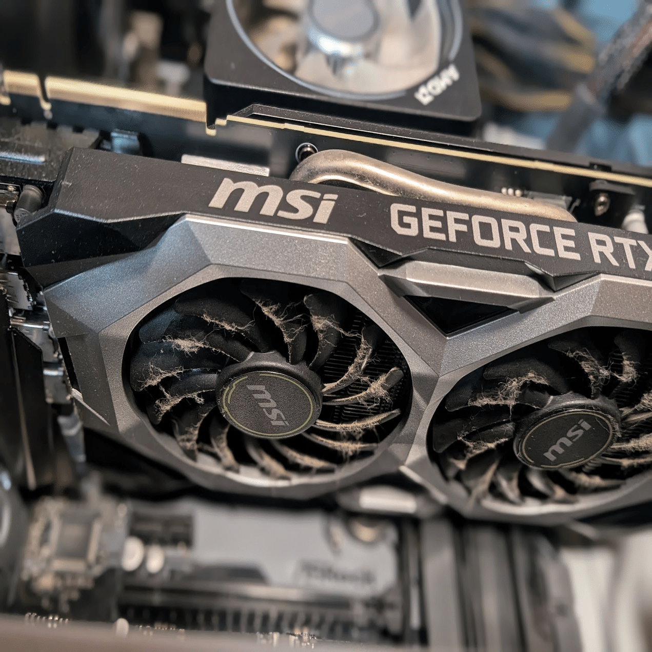 さらに、存在感のあるツインファンのグラフィックボード。中古品ゆえのホコリはご愛敬ですが、起動前にしっかり清掃。メンテナンスのしやすさもデスクトップならではの魅力ですね。