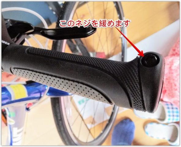ちまたので噂では元々のグリップを切断しなきゃいけないとか、短いグリップに換装しなきゃいけないとかいろんな噂がありましたが、とりあえずうちの場合はアーレンキーでネジを緩めただけで、切断作業などは特になく完了できました。