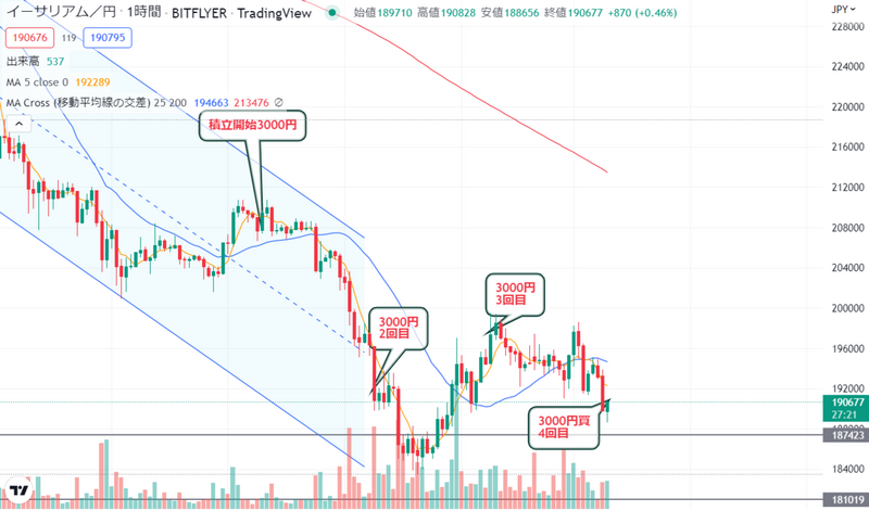 現在こんなかんじの積立ペース。上がればもちろん嬉しいし 下がったら下がったで「3000円で買えるイーサリアムが増える」わけですから 精神衛生上非常に楽なので チャートに貼り付いていられない人にはオススメですよ(笑)
