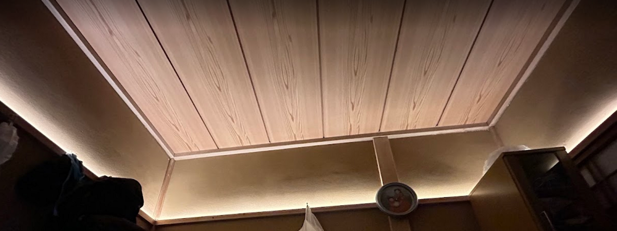 前述の写真の二枚目。天井近くの間接照明用LEDライトは全然OKなんですよ。 鴨居…いやこの場合は長押っていうのかな? その上に設置してあるから普段見えないんで