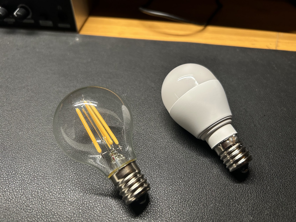 左がフィラメントタイプのLED電球。右が一般的なLED電球なんですけどね。