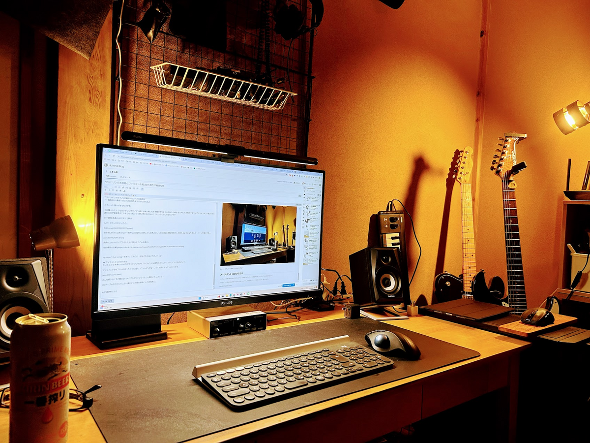 ウッドリングライトには楽器類を照らしてもらい フィラメントライトにはモニター裏を照らしてもらい。全体的な光量は長押(なげし)上のLEDテープライトで照らし! 全体的にいい感じの照明になったのでありました!!! というお話でした。
