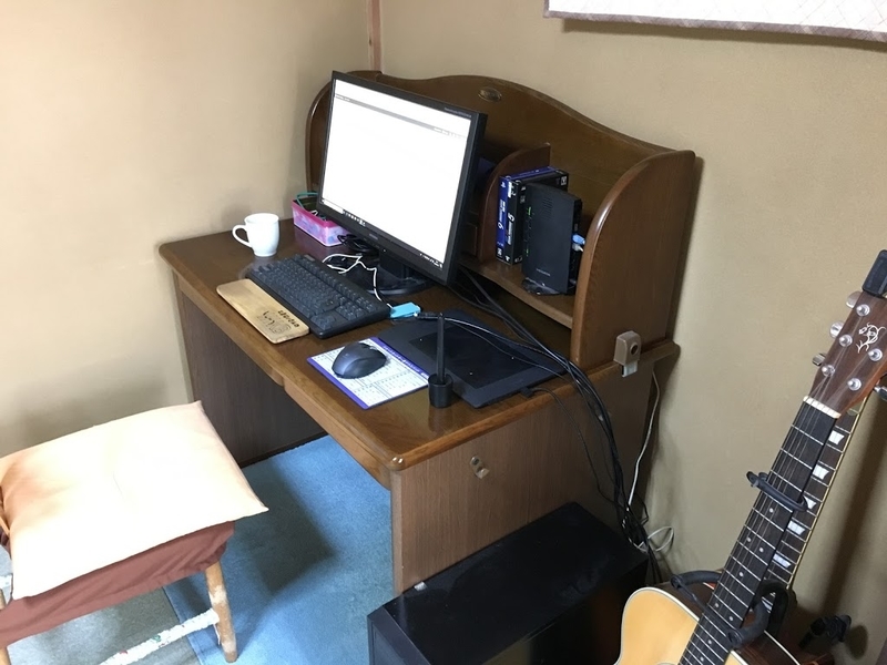 長年「座椅子PC」だったんですが、娘たちも進学で一人暮らしに旅立ってしまい、以前使っていた勉強机が余ってしまっているので、私のPC用デスクとして復活。