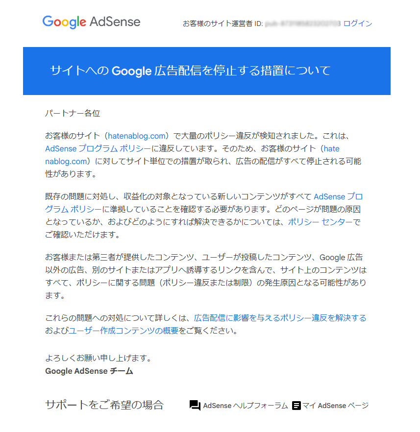 お客様のサイト(hatenablog.com)で大量のポリシー違反が検知されました。これは、AdSense プログラム ポリシーに違反していることを意味します。そのため、お客様のサイト(hatenablog.com)に対してサイト単位での措置が取られ、広告の配信がすべて停止される可能性があります。