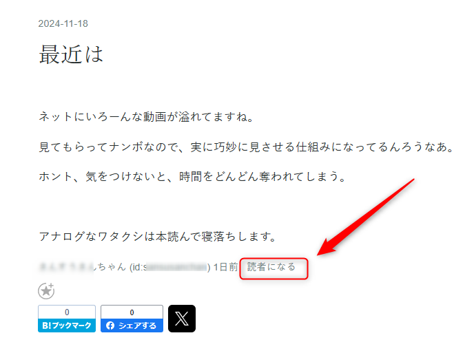 「よ~し記事読み終わったぞ~!この人おもしろいな~。読者登録したいな~」ってなった場合に どうせなら 記事の最後に「読者になる」ってのがあった方がうれしいじゃないっすか?