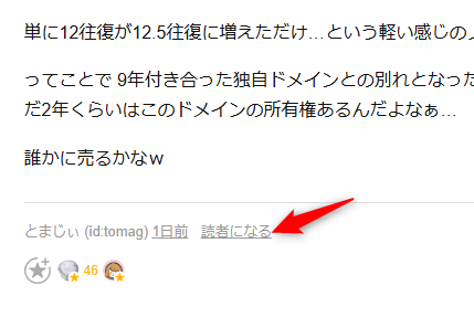 そこはもちろん 老舗のはてなブログさんですから 抜かりはないわけで。 記事を読み終わった後にはこんな感じの 「読者になる」へのリンクが存在します。