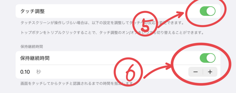 ④タッチ調整をON⇨⑤持続時間を自分好みに合わせる