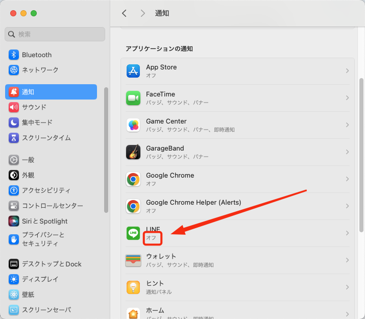 システム設定の「通知」。その中の「LINE」がオフになってます(涙