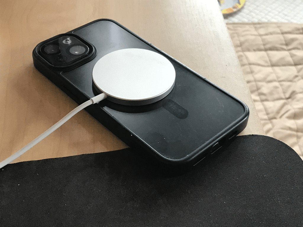 この充電器を買った当時はまだiPhone SEだったんでMagSafeにも対応してない頃でしたが、現在使ってる機種はiPhone14。って事は磁石でバッチリ固定できるMagSafe充電器が使えるって事で。