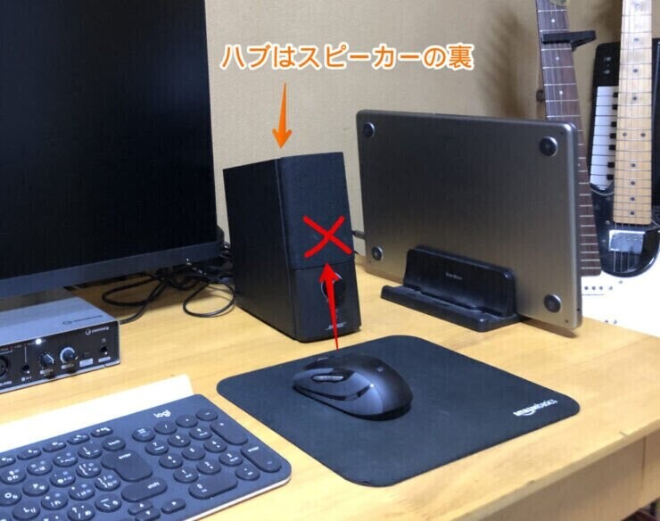 ハブを右側のスピーカー脇にもってきてMacも右側に持って来てみました。