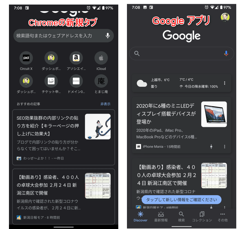 Chromeで新規タブを開いたとき、またはGoogleアプリのDiscoverで見ることができます。