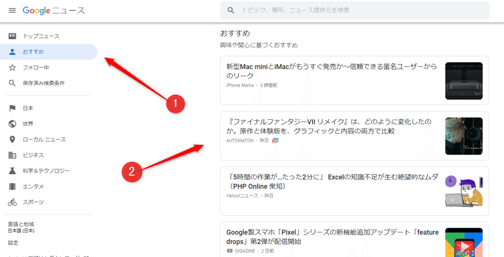 https://news.google.com/左メニューから「おすすめ」を選ぶ