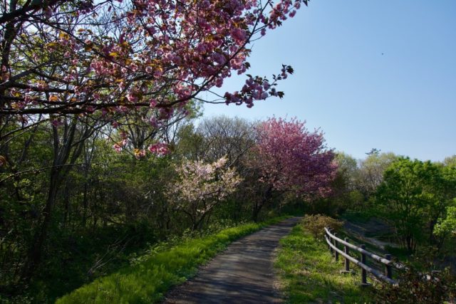 遊歩道沿いにもピンクの濃さが違う色々な種類の桜が咲いています。