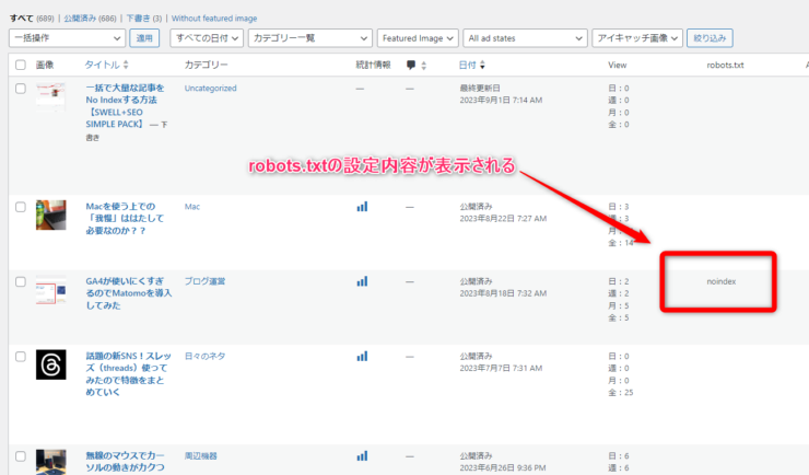 ということで 「投稿一覧」画面に robotsタグの設定値を表示する改造をします。