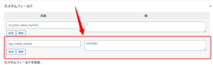 - カスタムフィールド名に「ssp_meta_robors」 値に「noindex」を設定