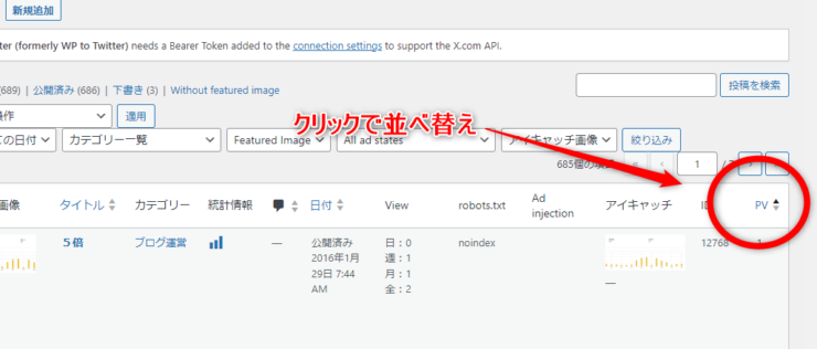 と大げさに言ってますが 一箇所クリックするだけです。投稿一覧右上の「PV」をクリックして降順に並べ替えましょう。