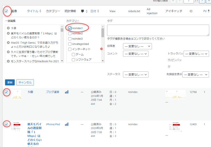 ですので 「アクセスが少ない記事を一括でNo Indexに設定する」 ためには「アクセスが少ない記事をまとめて同じカテゴリに登録する」という作業が必要になってくるわけです。
