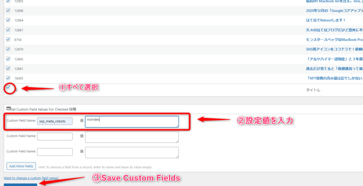 するとカスタムフィールドの編集記事を選ぶ画面が出てきますので そこから先ほど作った「noindex1」カテゴリを選択します。そして「Apply」で表示