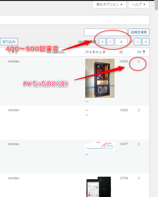 700記事近くの記事をPV少ない順に並べかえて1ページあたり100記事を表示する設定。それの4ページ目…つまり少ない方から400記事目のPVが2です(涙