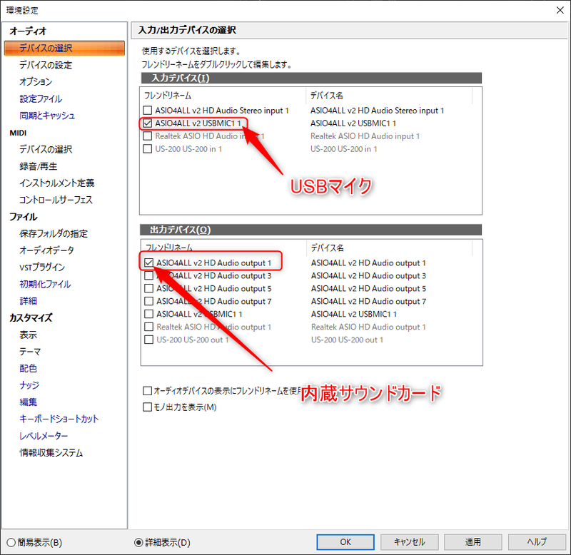 一般的なオーディオインターフェースの設定の場合「入力と出力は同じ機材しか選べない」場合がほとんどなのですが、汎用ドライバであるASIO4ALLの場合だとこういった融通の聞く設定ができるのもうれしいところ。