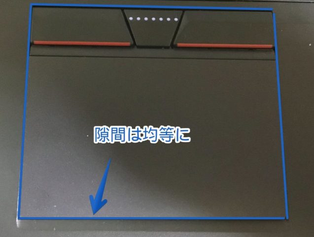 新しいタッチパッドを「接着」する際、多少の「余裕」があるのですが、その「隙間」が偏ってしまうと「干渉して右クリックだけボタンが押せない」なんて事もありますので、位置決めは慎重に(わたしも一度目の接着時に右クリックが押しっぱなしになってしまい外してやり直しましたから・・・)