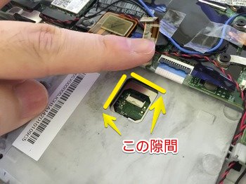 うっすらセロファンテープ的なものが貼ってある下にあるのが、液晶と本体をつなぐケーブル。何か「先っぽが尖ったもの」などで、テープの端を浮かせて剥がしましょう。