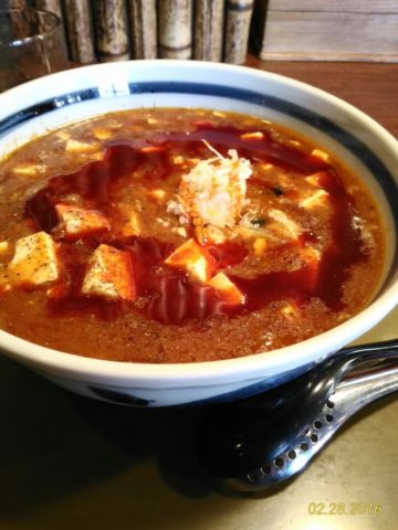 スープそうに浸かっている麺は麻婆層を通過する際に辛味による予備洗浄の儀式を通過する。 そして麻婆層でスープの旨味を洗浄された麺は、さらにラー油層で辛みのコーティングをされる事になる。